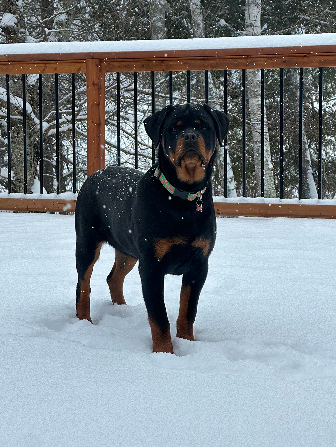 Coco incarne parfaitement le standard recherché chez la femelle Rottweiler: élégance, équilibre et fiabilité. Elle transmettra certainement à sa descendance une belle ossature, un tempérament stable et une grande expression de race.