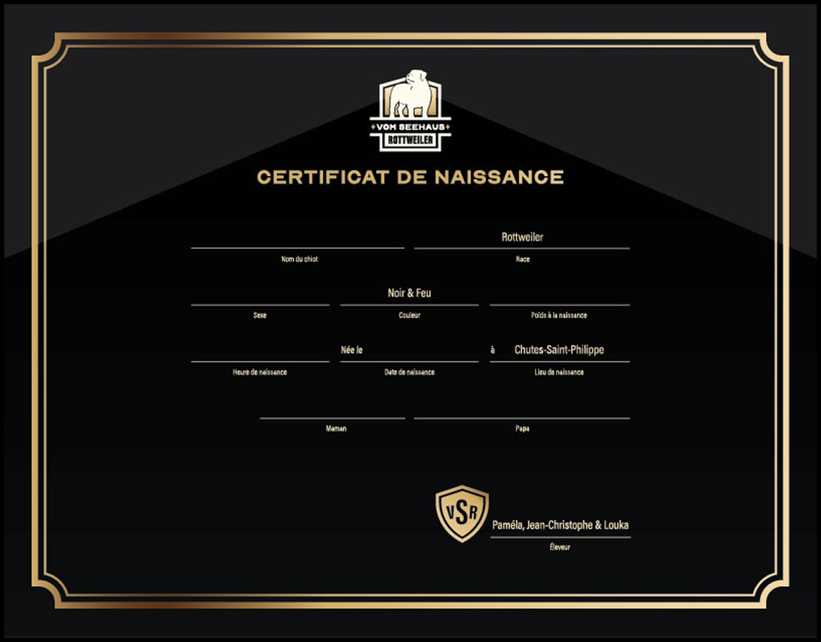 Chaque chiot reçoit un certificat de naissance personnalisé, regroupant des informations comme son heure de naissance, sa couleur et ses particularités. Un souvenir soigné de ses premiers instants, à conserver avec affection.